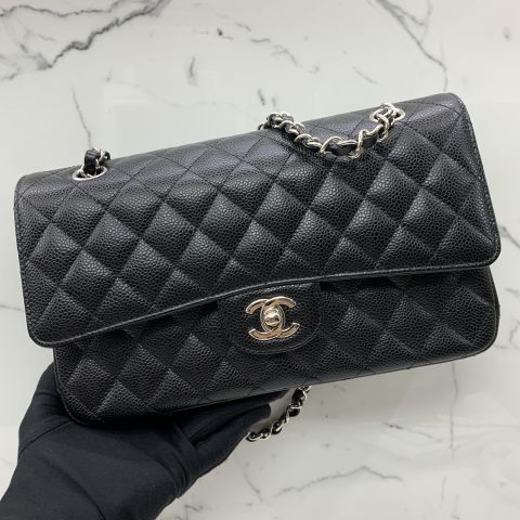 CAVIAR SKIN 25CM MEDIUM DOUBLE FLAP BLACK SHW NO.28 W/CARD