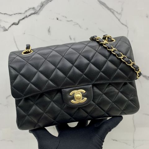 LAMBSKIN 23CM SMALL DOUBLE FLAP BLACK GHW MICROCHIPPED