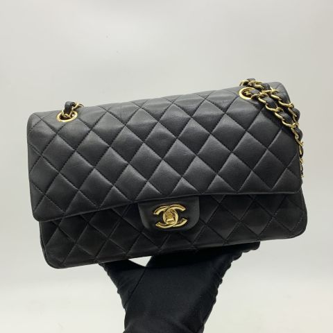 LAMBSKIN 25CM MEDIUM DOUBLE FLAP BLACK GHW NO.15 NO CARD