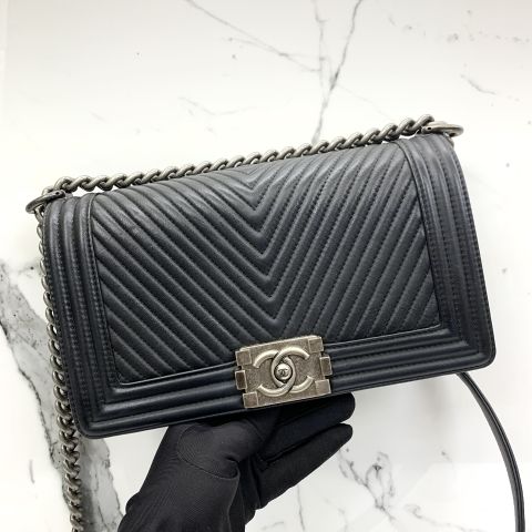Chanel No. 19 Old Medium Boy Bag in Black Chevron Leather