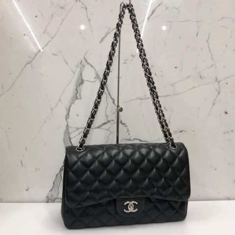 Chanel No.17 Jumbo Classic Flap Bag, Black Lambskin Leather