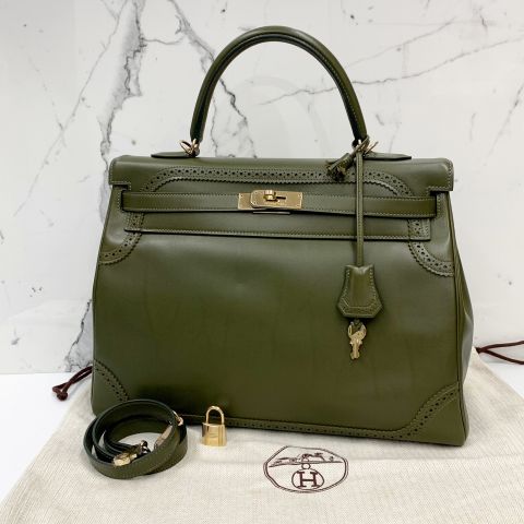 Hermes Kelly Ghillies 35, Olive Green Swift, Q Stamp